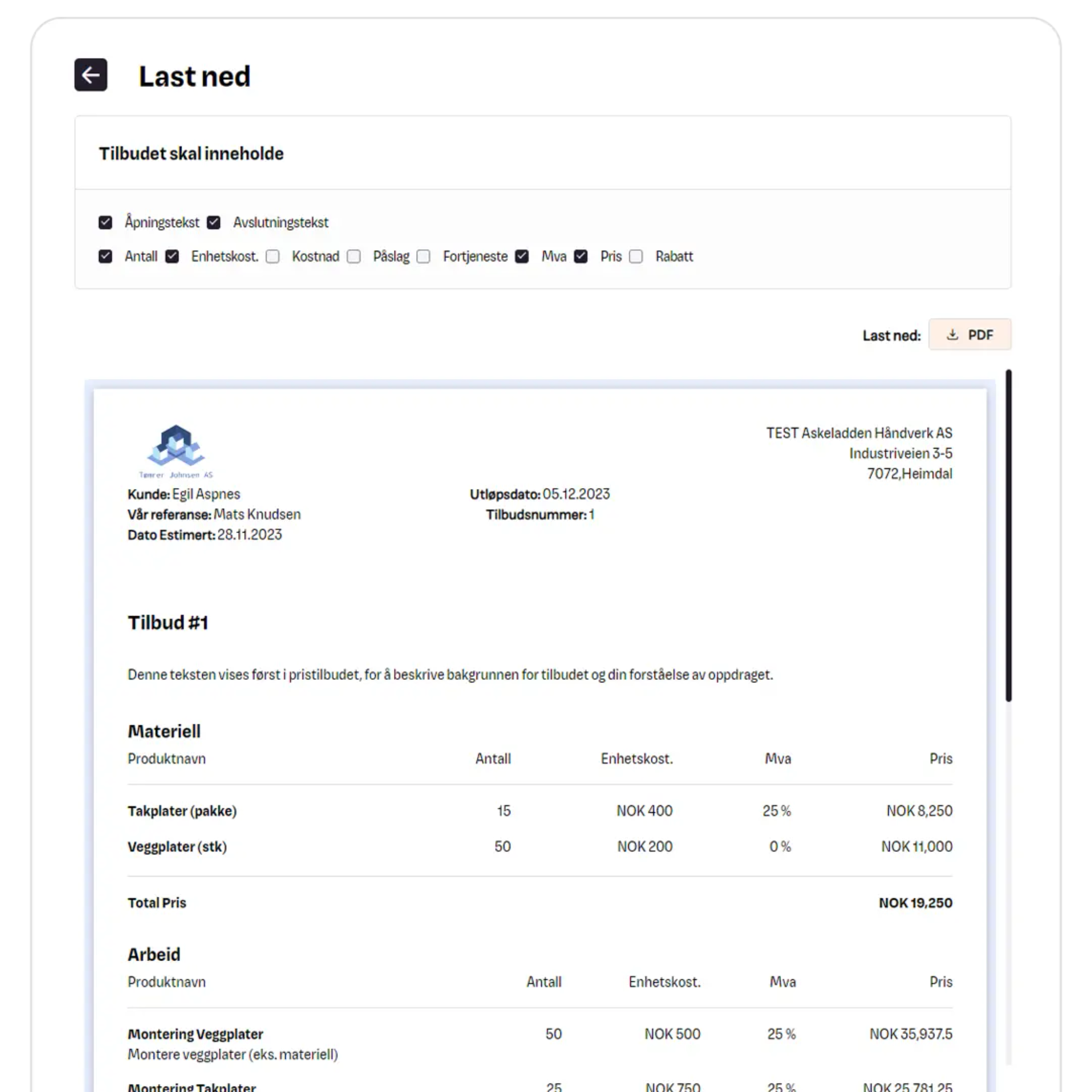 Oversiktlige pristilbud som vekker tillit hos kundeneVelg hva kunden skal se og last ned et profesjonelt pristilbud som garantert skiller deg ut fra konkurrentene.